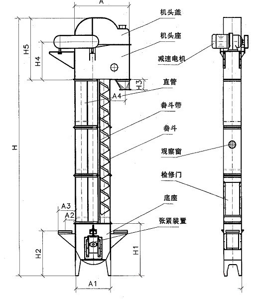 斗式提升機(jī)由上部區(qū)段、中部機(jī)殼、下部區(qū)段、帶料斗的輸送帶等牽引部件、傳動裝置和室外檢修平臺組成。